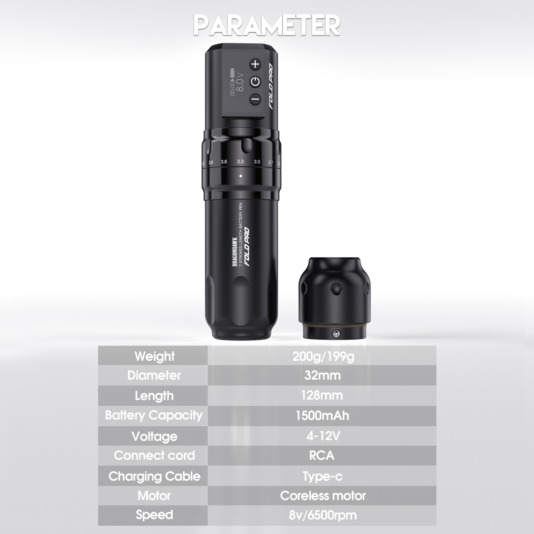 Veliki kapacitet baterije: Kapacitet od 1500 mAh omogućava umetnicima da rade dugo, 4-6 sati. Kada se baterija isprazni, RCA konektor se može zameniti. Jednostavan operativni sistem: LED ekran jasnije prikazuje bateriju, vreme i napon. Umetnici mogu lako da podese napon pritiskom na dugme.